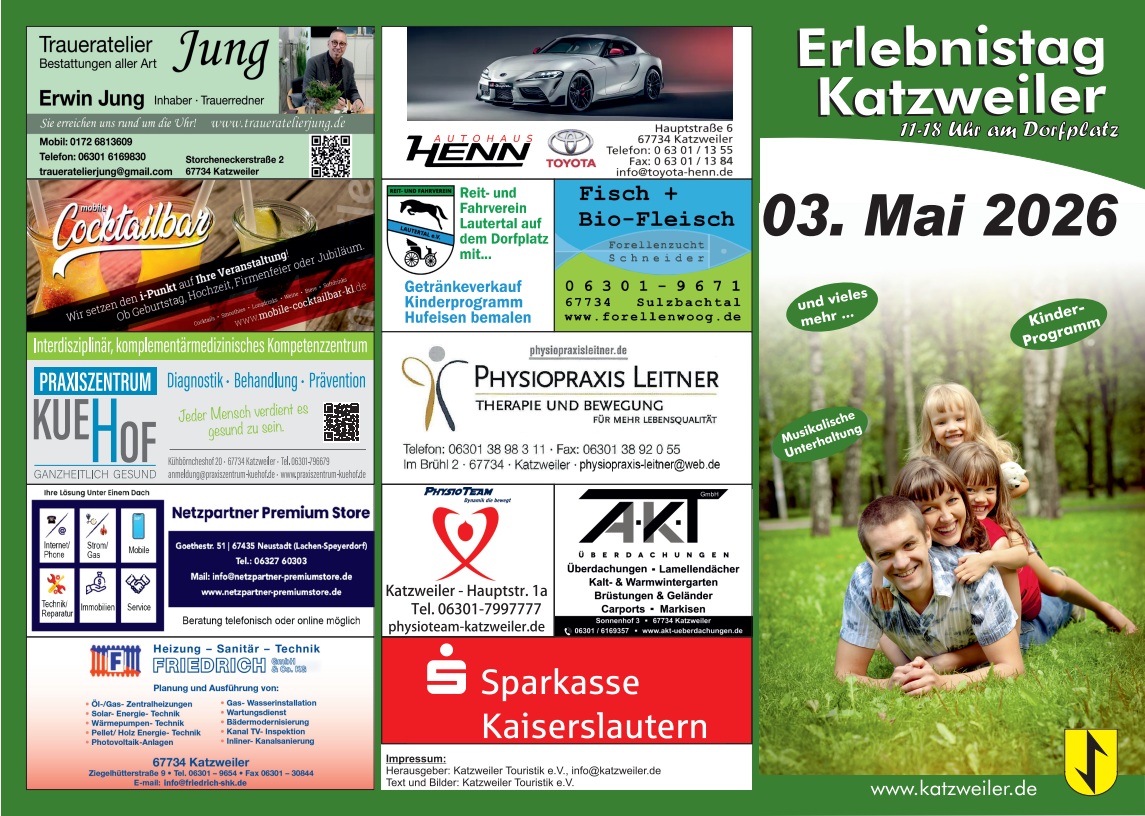 Auch in diesem Jahr findet wieder von 11-18 Uhr der Erlebnistag Katzweiler auf dem Dorfplatz statt.